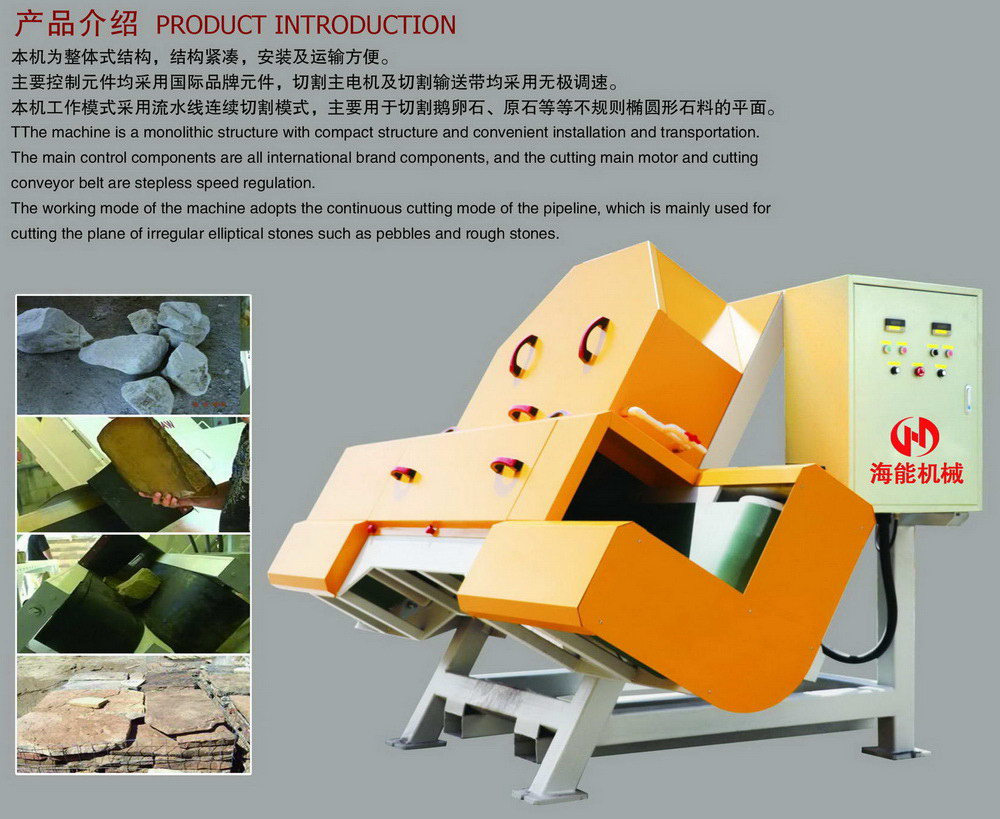Le mode de travail de cette machine adopte le mode de coupe continu de la ligne de montage, principalement utilisé pour couper le plan des cailloux, des pierres brutes et d’autres pierres ovales irrégulières.